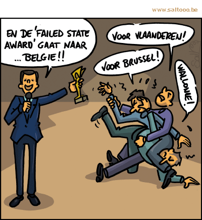 Cartoon over de vraag of belgie nu een zogenaamde failed state is of niet. Een failed state wordt doorgaans gebruikt voor een staat waar de regering de controle is verloren. Belgie kreeg de term op zijn hoofd geplakt na de aanslagen in brussel en parijs, waarbij de daders terroristen bleken die een grote gemeenschappelijke factor hadden met molenbeek