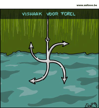 Cartoon: Cartoon over hoe je best forel kan vangen. Met dank aan tv kok Jeroen Meus en Adolf Hitler Tv kok Jeroen Meus maakt met plat prefere, een programma rond bekende mensen en hun lievelingsgerecht. Bij de Duitse keuken kwam hij niet tot een positief bekende duitser maar wel bij Adolf Hitler. Die zou het liefst forel in botersaus hebben gegeten. Dankzij Adolf Hitler en Jeroen Meus weten we nu hoe we bij het vissen efficient forel kunnen vangen, met dank aan het nazi symbool bij uitstek: de swastika. Het tv programma is uiteindelijk met de geladen achtergrond gelukkig niet uitgezonden